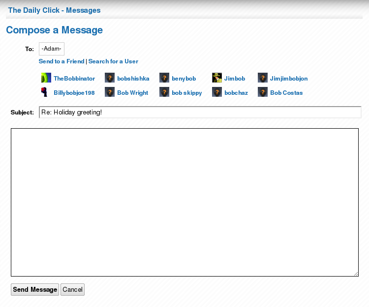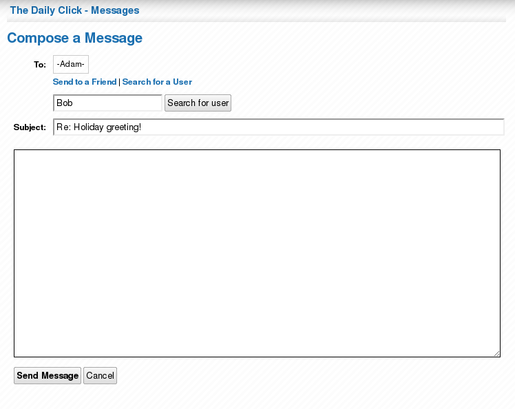 The next screen-shot shows the "Compose message" page. Again, the basic feature is the same except it is now much easier to find and send messages to users. You can select a user from your friends list, or search for a user (see screen-shots below) extremely quickly. All of this is done using background requests - so no loading new pages or opening pop-up windows!